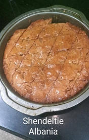 Description: Albanian Shendetlie is an Albanian dessert and is a cross between a biscuit and cake. The first texture when removed from the oven resembles a biscuit, however, once the syrup has been added the baked dough softens and the final finish is a cake texture.