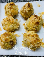Description: Mchewek is a traditional Algerian pastry made with almonds, sugar, and eggs. It has a soft, chewy inside and a crunchy outside, thanks to being rolled in slivered almonds before baking. The name Mchewek comes from the Arabic word meaning “prickly” or “thorny,” referring to the pastry’s outer appearance. The slivered almonds covering the Mchewek give it a slightly rough and “spiky” texture, which is where the name comes from.